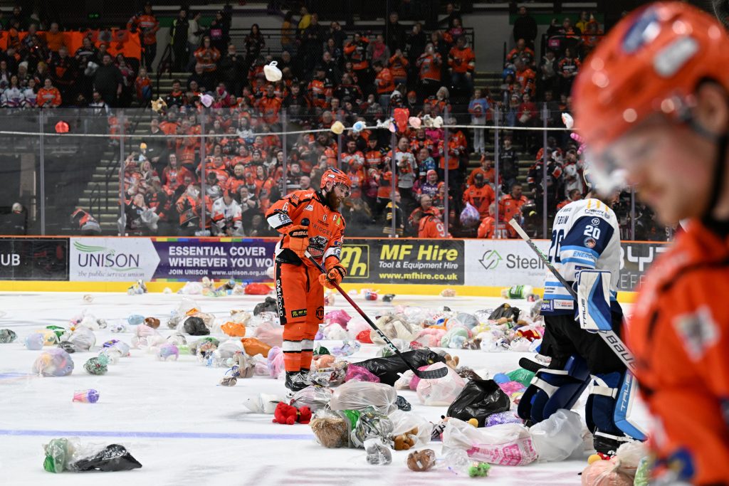 However, the lead lasted just 31 seconds. Steelers’ Mikko Juusola drove wide and cut to the net, finishing smartly past Robson from passes by Mitch Balmas and Mitch Heard. The goal triggered the release of more than 3,000 teddies onto the ice for Sheffield’s Air the Bear night in support of Cash for Kids’ Mission Christmas.