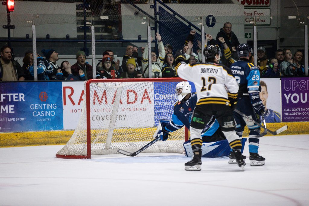 Coventry’s struggling powerplay finally sparked into life at 14.19, when Grant Mismash’s effort squeezed past Kevin Carr. The goal went unassisted after the puck deflected into the net off the Panthers goalie.